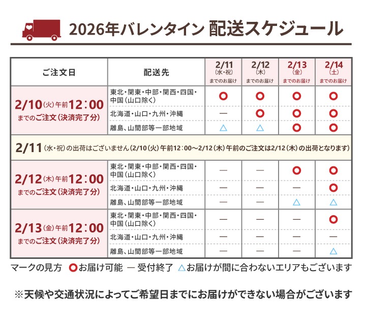 バレンタインの準備は進んでおりますでしょうか。 2/14バレンタインのお届けについて、各地域の配送スケジュールをお知らせいたします。